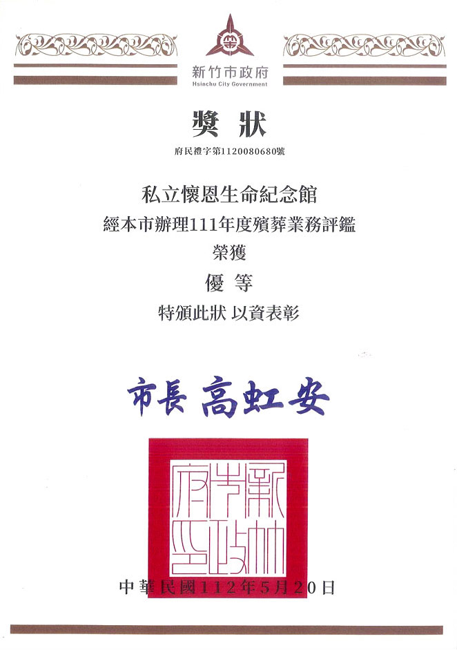 恭賀懷恩生命紀念館 再次榮獲 新竹市政府殯葬設施評鑑 優等